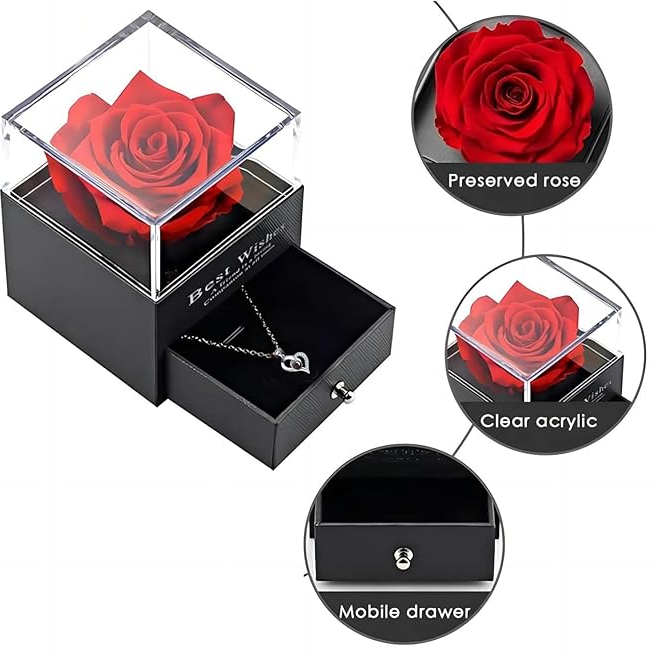 Collar en forma de corazón con caja de joyería:La rosa eterna se presenta en una elegante caja de regalo que también es un mini joyero.El collar en forma de corazón en la caja de joyería que significa "Te Amo en 100 idiomas".
